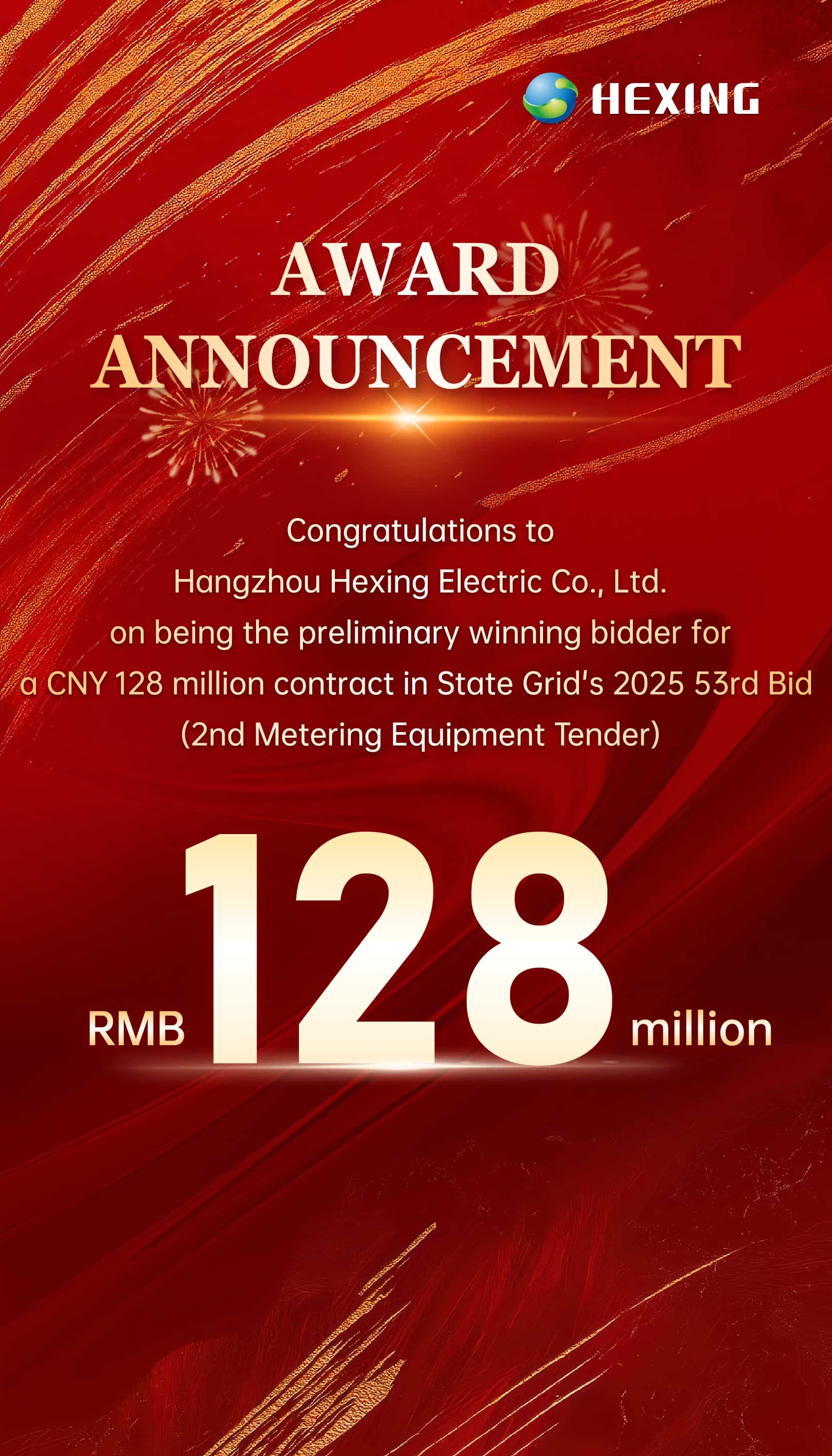 Warm congratulations to Hangzhou Hexing Electric Co., Ltd.on being the preliminary winning bidder fora CNY 128 million contract in State Grid's 2025 53rd Bid(2nd Metering Equipment Tender)!